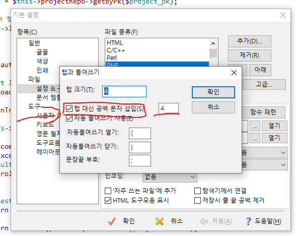 - 탭 대신 공백 문자 삽입(클릭) > 4(입력) > 확인